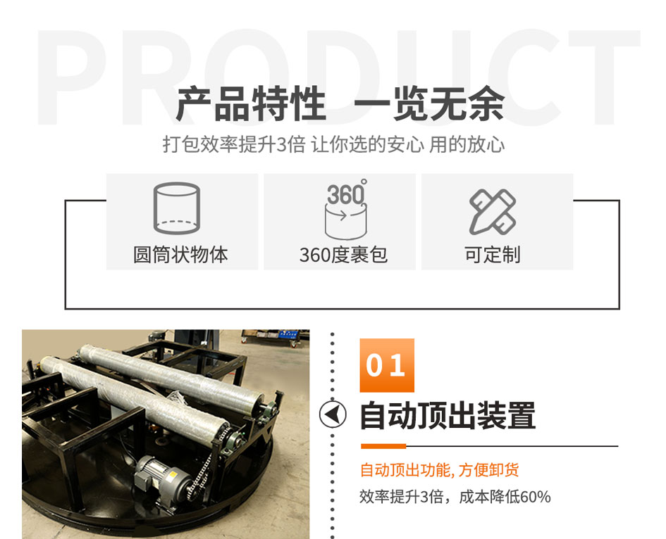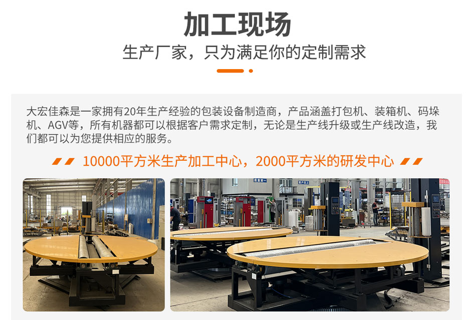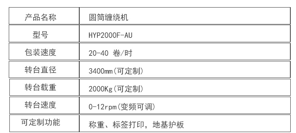 大宏佳森圓筒纏繞機HYP2000F-AU包裝機采用PLC自動控制,性能可靠,可根據需要改變纏繞方式和次數;轉臺自動復位,保證貨物進出定位準確;用戶可選擇拉伸或預拉伸薄膜裝置;根據客戶需求,選配光電控制頭,自動測高根據需要設計制造配套生產線。
