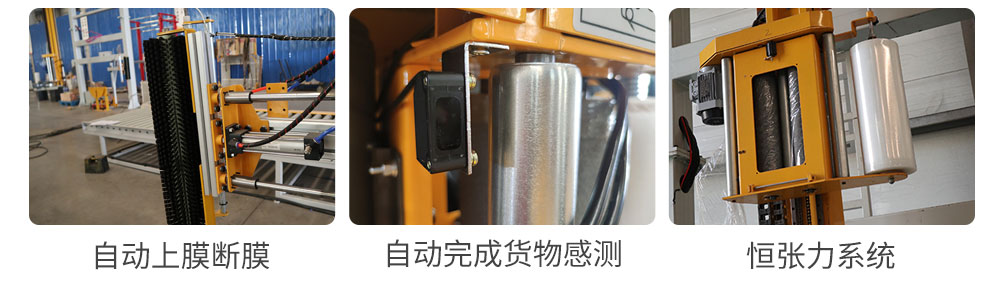 可實現(xiàn)流水線包裝,貨物不動,設備上的纏繞膜圍繞著貨特運轉(zhuǎn)