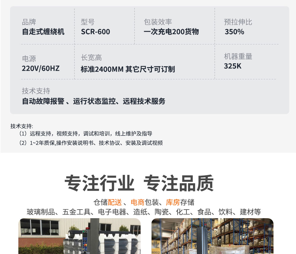 自走式纏繞機SCR-600不受貨物尺寸及重量限制,滿足各種不同形狀包裝物,自動化程度高,